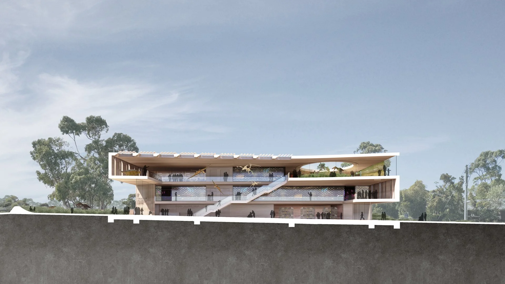 Envisioned as a space where 125 million years of the region's rich paleo-history and cultural heritage could be celebrated and showcased, the Cultural Discovery Centre is positioned centrally for both visibility and access. Nestled into the heart of Inverloch beside Rainbow Park and the Glade, it is important that the building could become a significant civic anchor for the Bass Coast and the Dinosaur Trail.