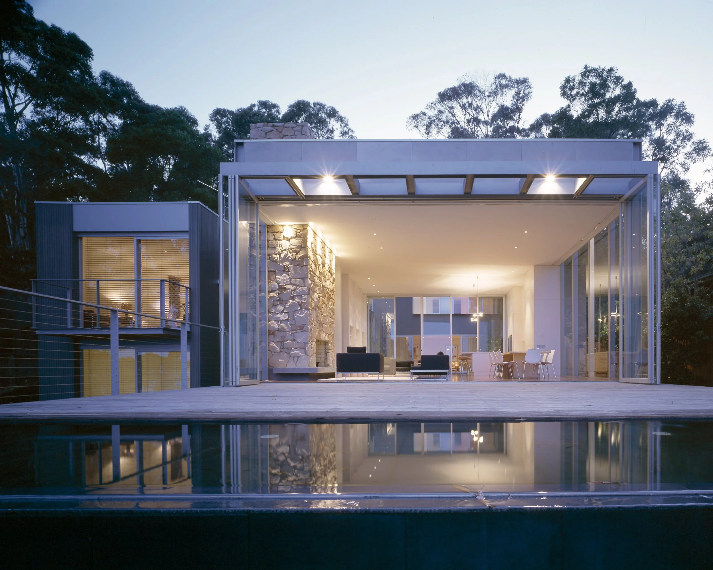 Set against the dramatic backdrop of Loutitt Bay, Lorne House 1 is conceived as a compound of distinct, interconnected structures, linked by a glazed circulation spine. The design responds to the steeply sloping site, strategically arranging the components to frame and define a series of external spaces that function as implied outdoor rooms.