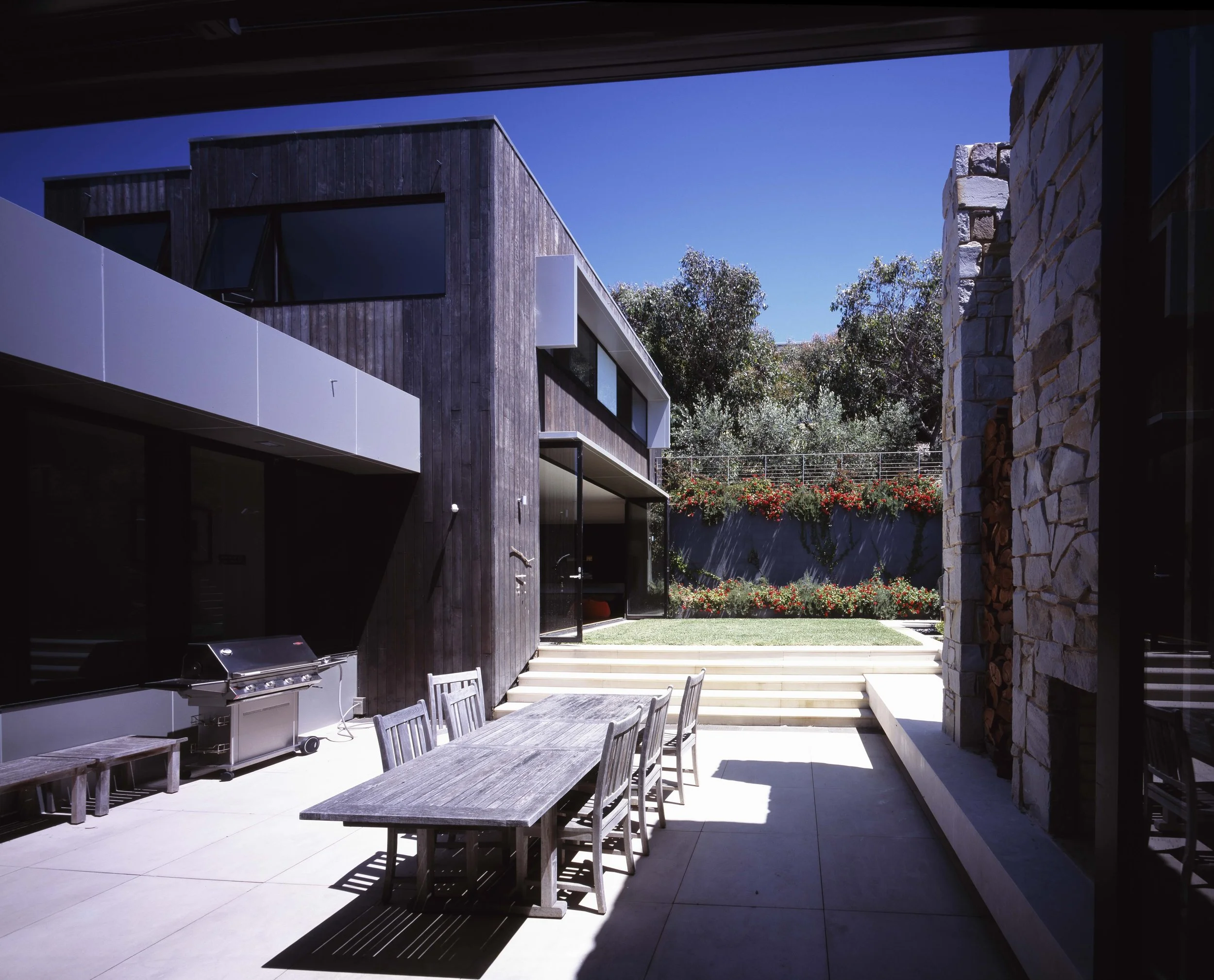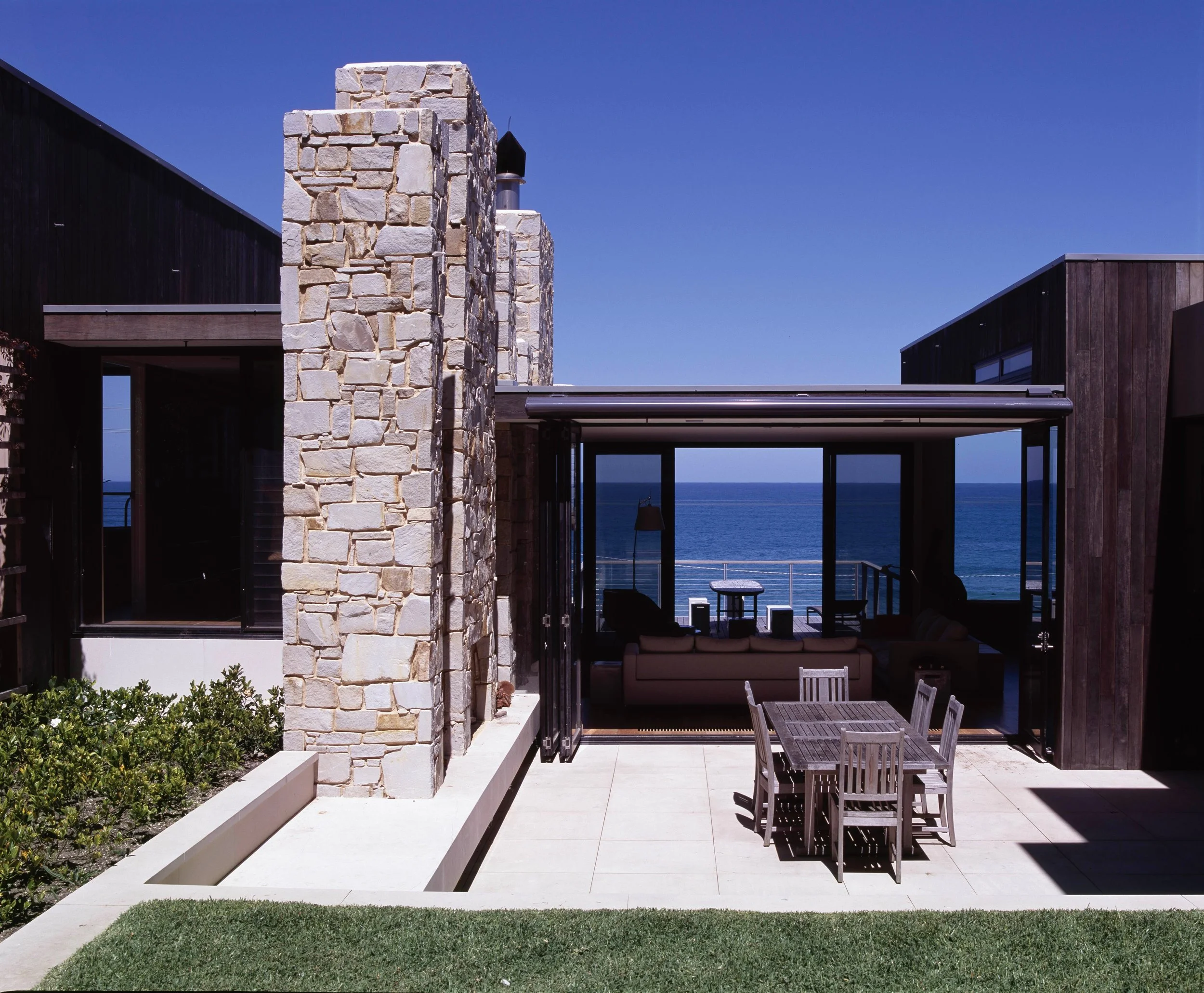 Lorne House 2 is an elegant composition of timber-clad structures, thoughtfully arranged to capture expansive views towards the sea. The design prioritizes both connection to the landscape and a sense of privacy, with the flanking timber wings strategically positioned to screen the house and its adjoining courtyards from neighbouring properties. A robust limestone spine anchors the composition and acts as an active wall with internal and external fireplaces and wood storage capturing the essence of hearth and home.