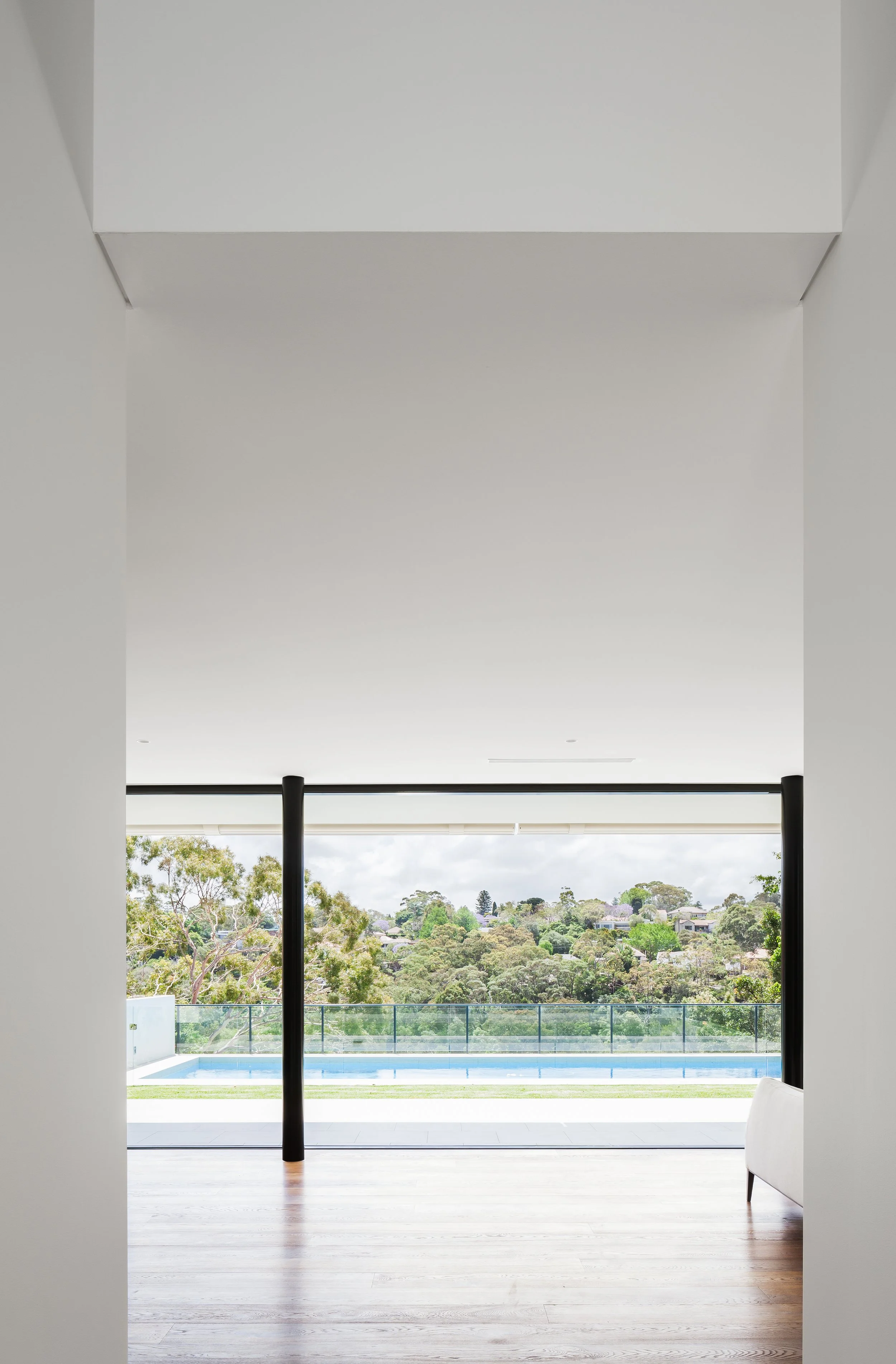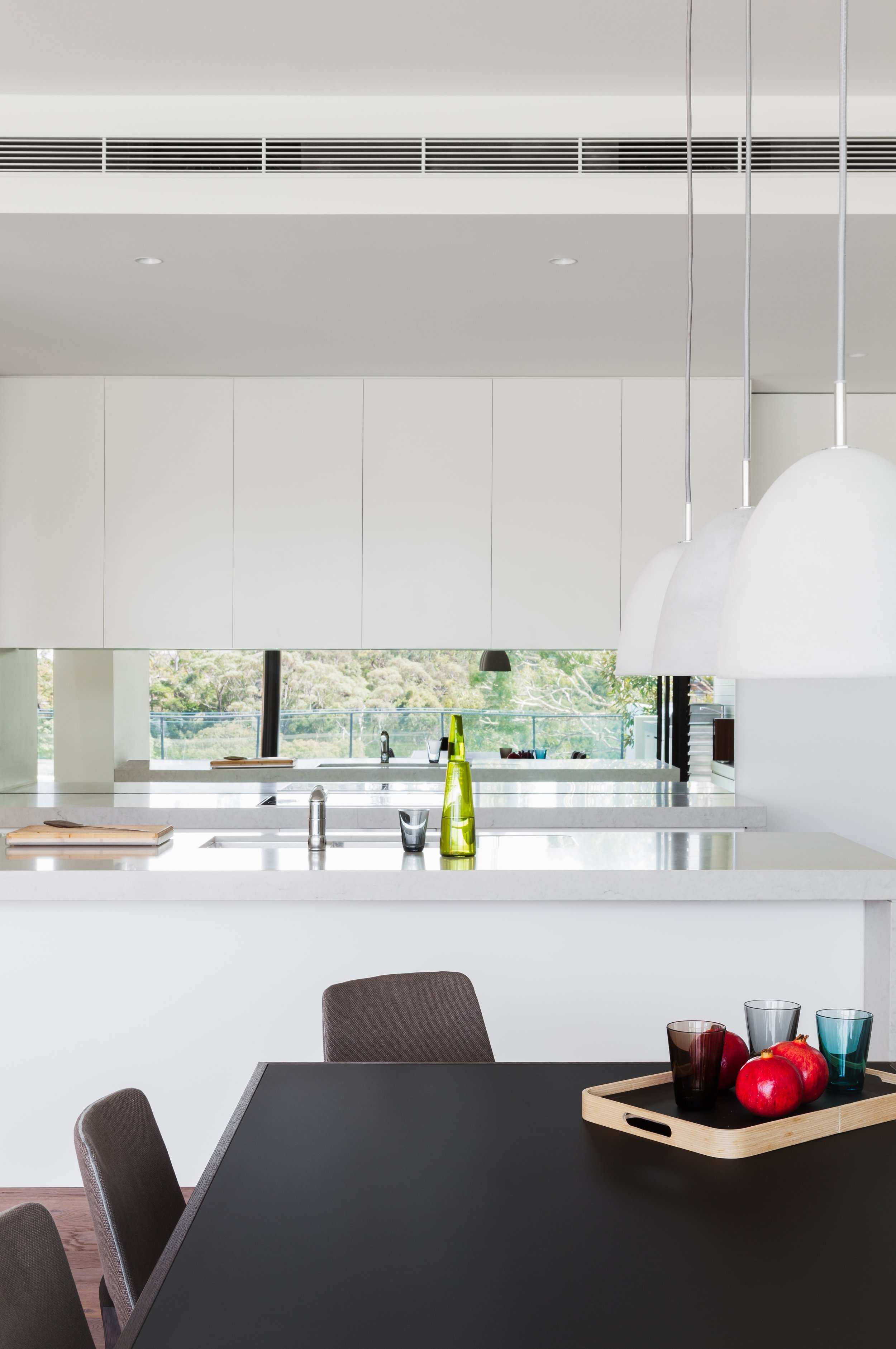 The double storey dwellings step down the site in response to the steep topography, and are organised to optimise connectivity between the main living spaces and the respective outdoor recreational areas and pools. A composition of rectangular forms integrate the dwellings to the site and provide a sculptural play of forms articulated by solid and voids. Sliding screens modulate light and glare to the interior spaces.