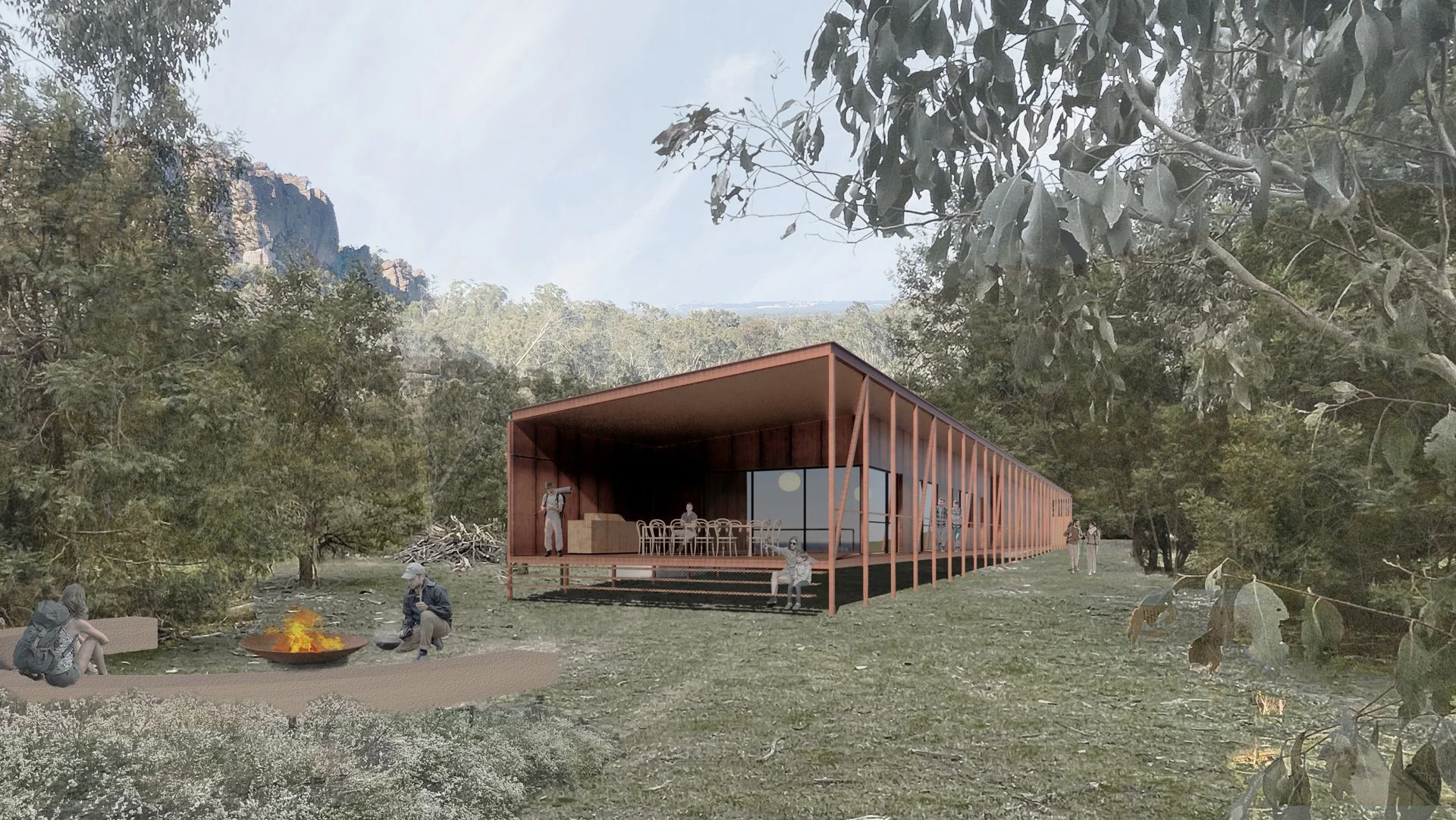 Set within the dramatic landscape of the Grampians (Gariwerd) National Park, Roses Gap Eco Lodge is proposed as an off-grid retreat for hikers, designed to sit gently within its rugged bushland setting. The linear plan stretches along the contours of a long narrow site, offering expansive views while drawing northern sun into communal areas and morning light into bedrooms.