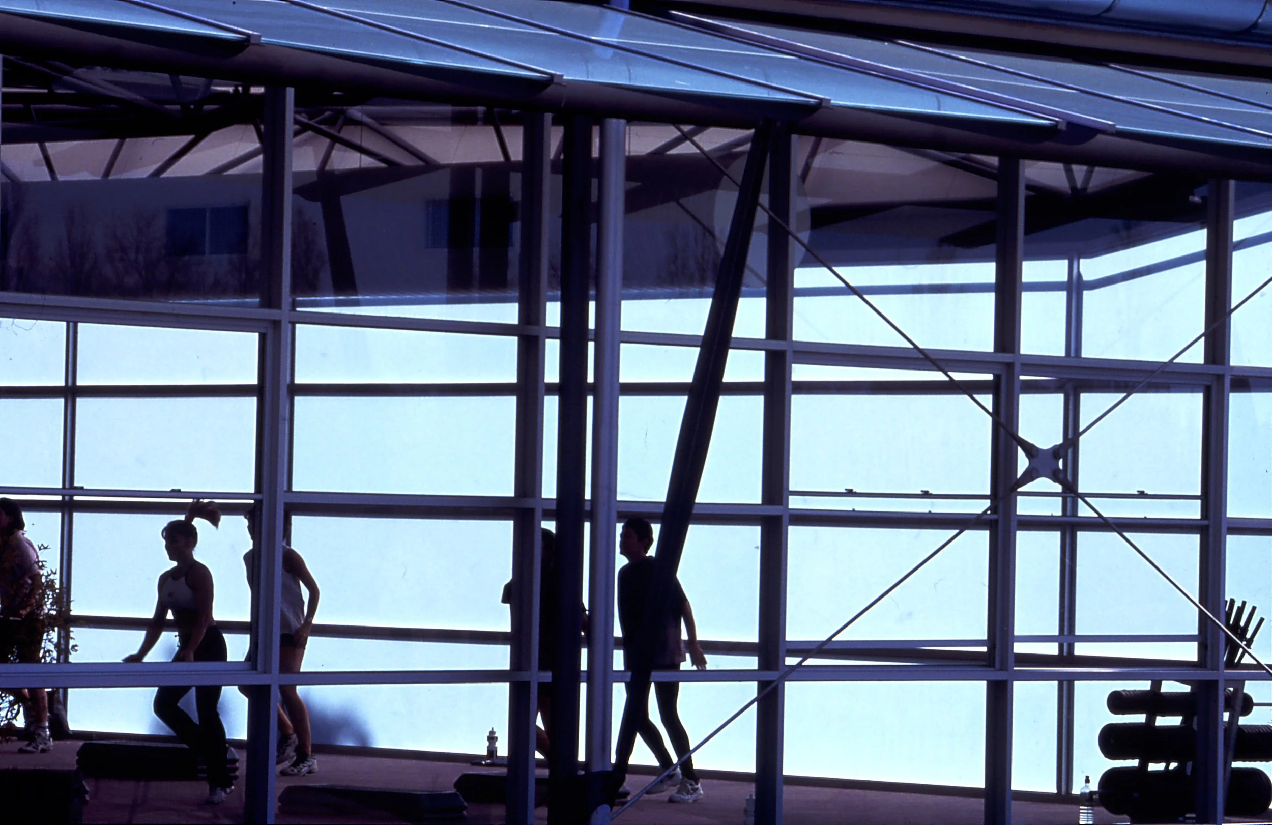 The architecture is defined by elegant, tapered steel trusses arranged radially, forming a gently curved plan that mirrors the fluidity of the water. Custom tapered skylights top the structure, introducing natural light that enhances the feeling of spaciousness and connection to the outdoors, creating an inviting and uplifting environment throughout the year.